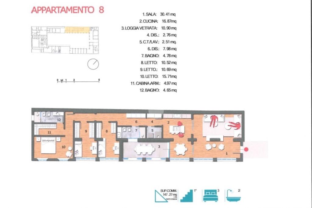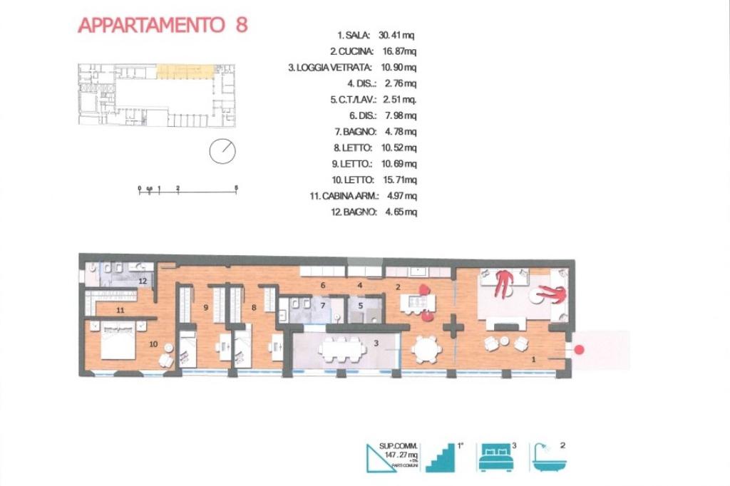 L'appartamento, che sarà consegnato completamente ristrutturato con finiture di alta qualità, si compone di: