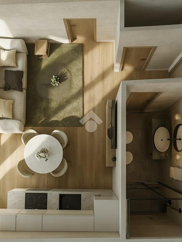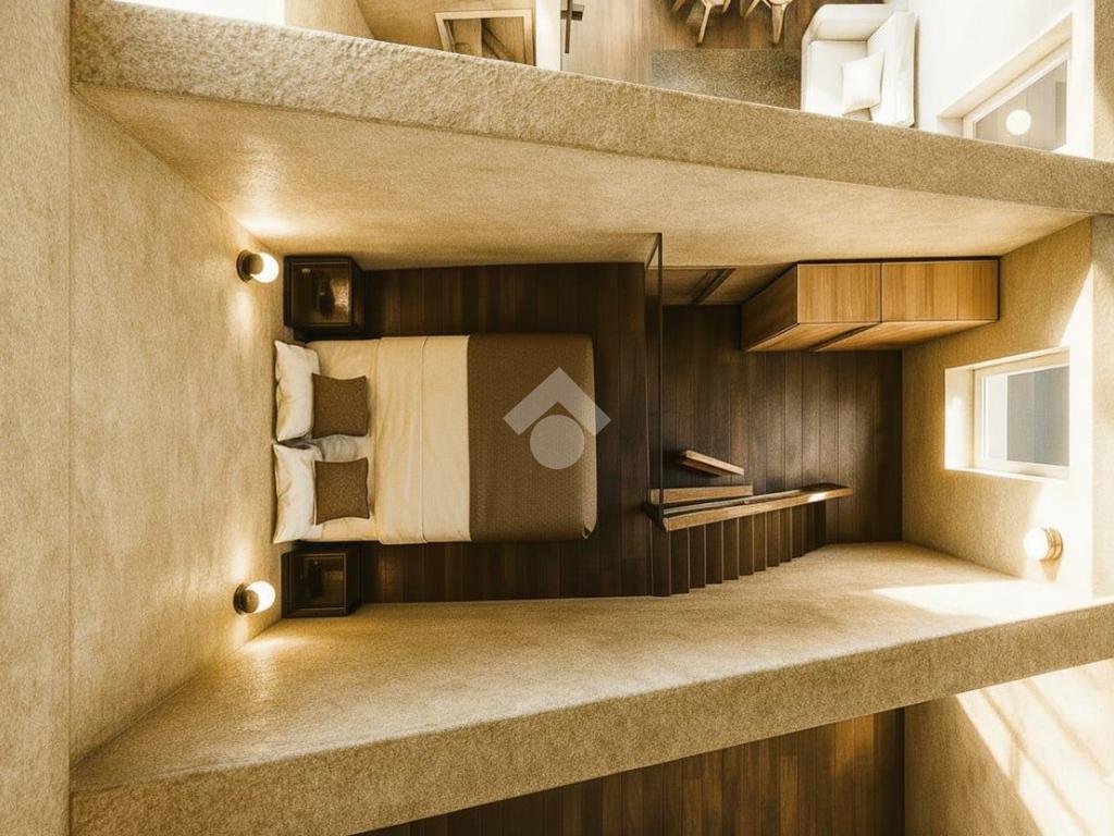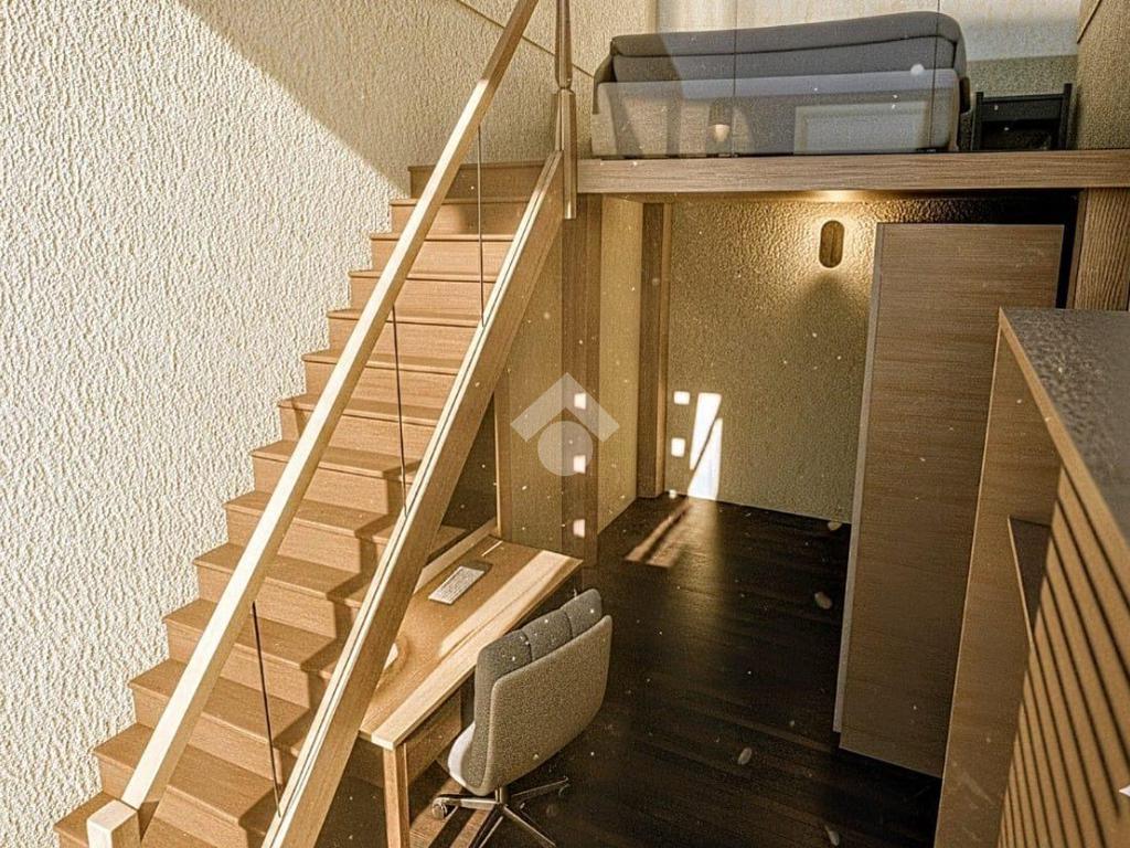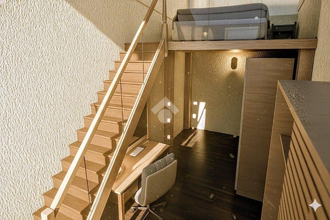 Il soggiorno con cucina a vista è perfetto per momenti di convivialità, offrendo un ambiente caloroso e contemporaneo. La camera da letto distribuita su doppio volume, essendo dotata di un soppalco di 6 mq, offre la possibilità di un utilizzo versatile e molteplice.