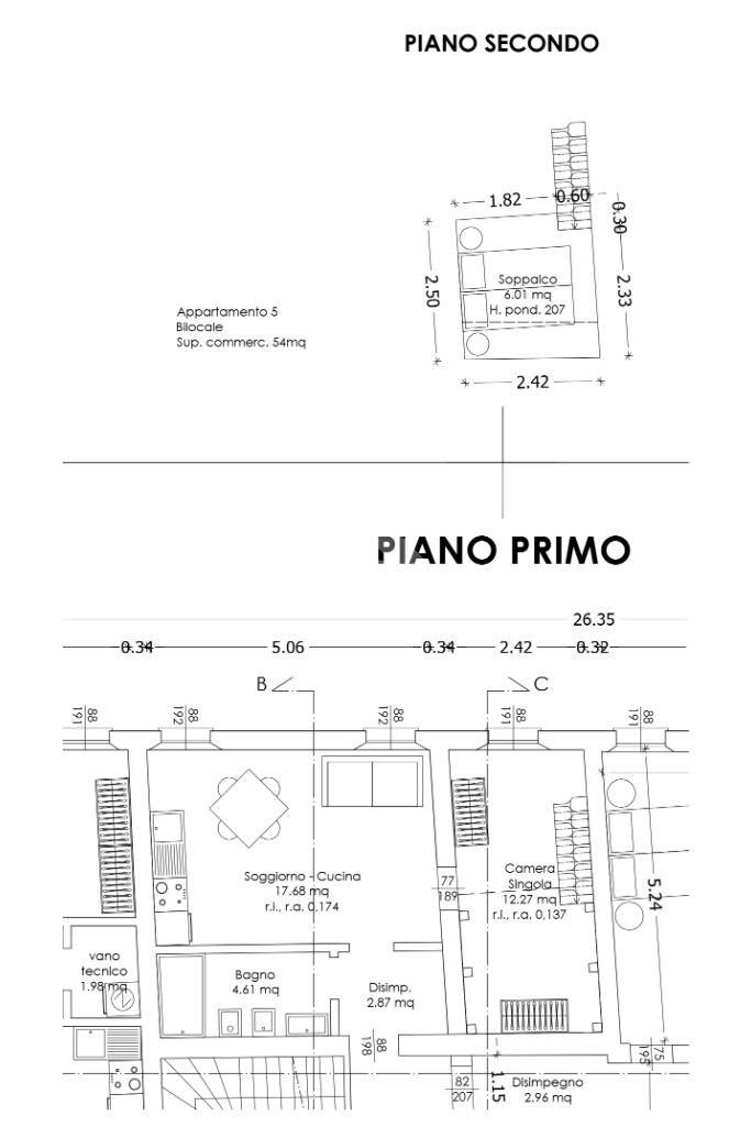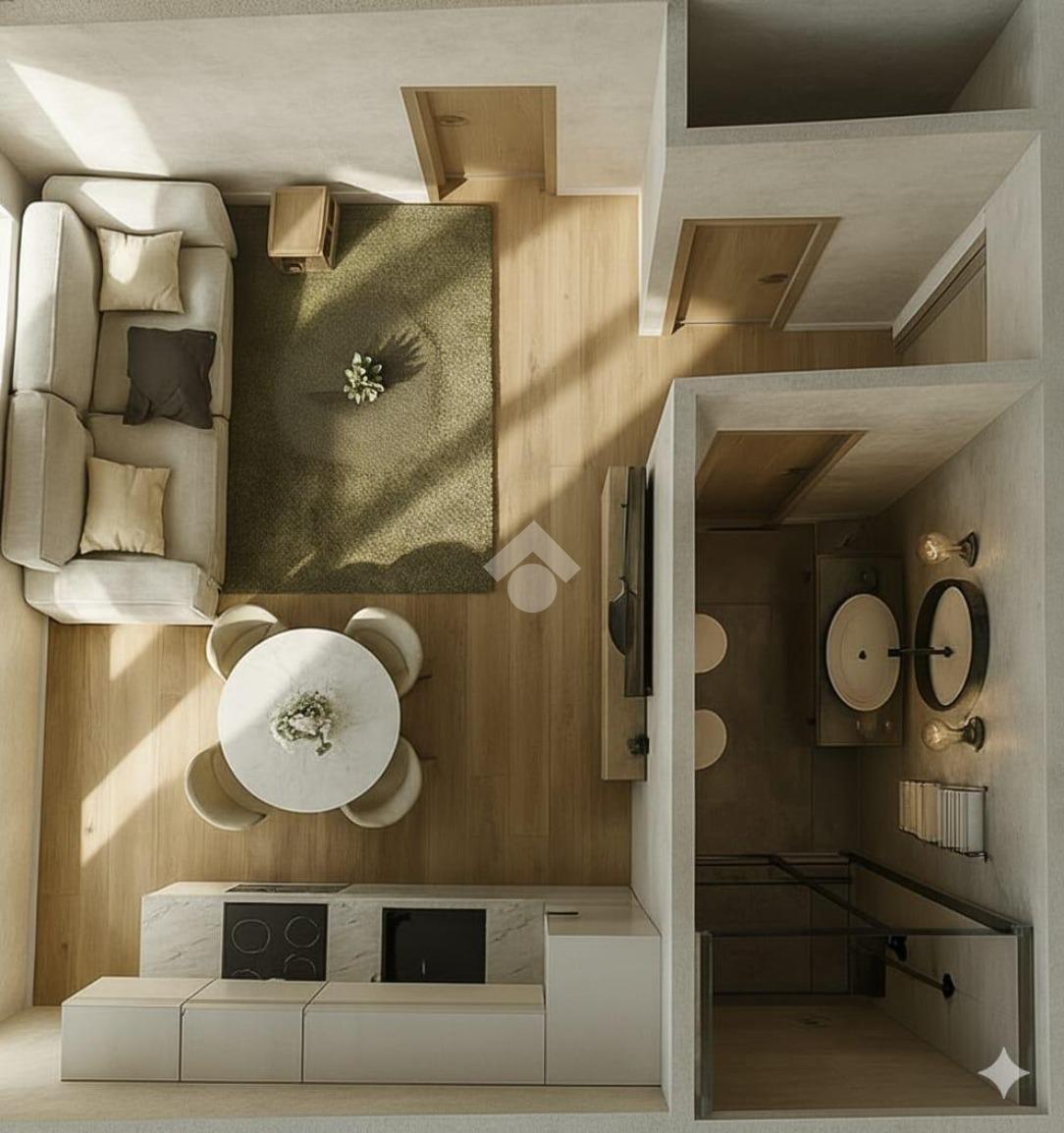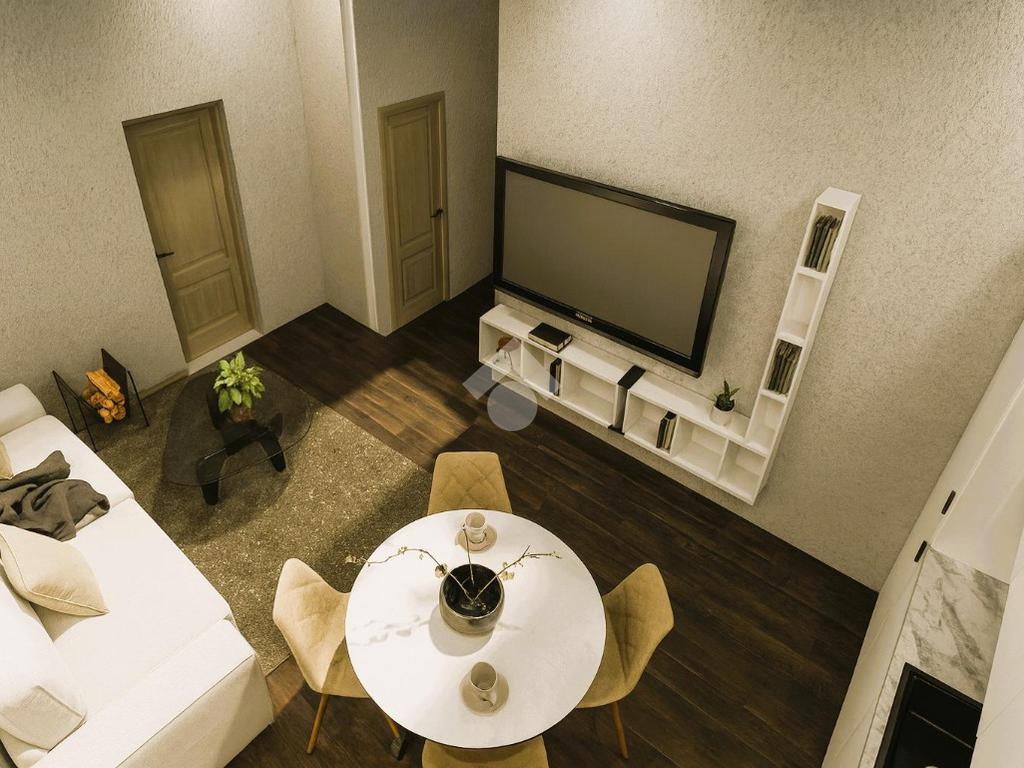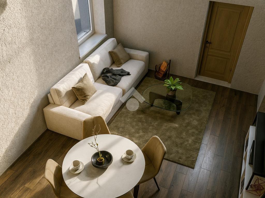 Il soggiorno con cucina a vista è perfetto per momenti di convivialità, offrendo un ambiente caloroso e contemporaneo. La camera da letto distribuita su doppio volume, essendo dotata di un soppalco di 6 mq, offre la possibilità di un utilizzo versatile e molteplice.