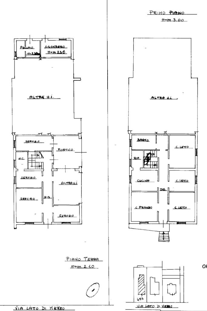 Prima unità composta da ingresso con scala esterna, disimpegno, soggiorno, tinello con cucinotto, 3 camere da letto e bagno. Al piano terra 3 vani cantina, ripostiglio, bagno e autorimessa.